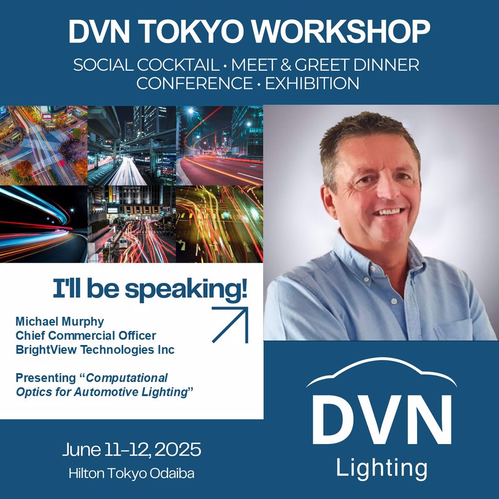 The DVN Tokyo workshop has been a busy event for BrightView, with enormous interest from the automotive OEM’s and Tier 1’s in the use of computational optics products for the next generation of lighting solutions. Our Chief Commercial Officer, Michael Murphy, participated in the Innovative Technology session, and discussed how computational optics is supporting the automotive lighting transformation to achieve lighter, thinner, lower cost and more electrically efficient lighting systems.
